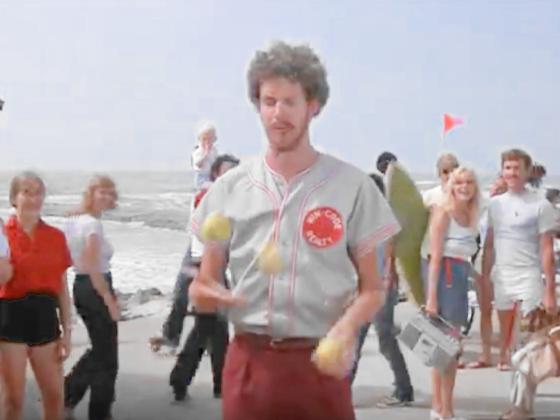At 1:22:26, in a scene at the beach, Turk Pipkin plays a street performer juggling and eating 3 apples.