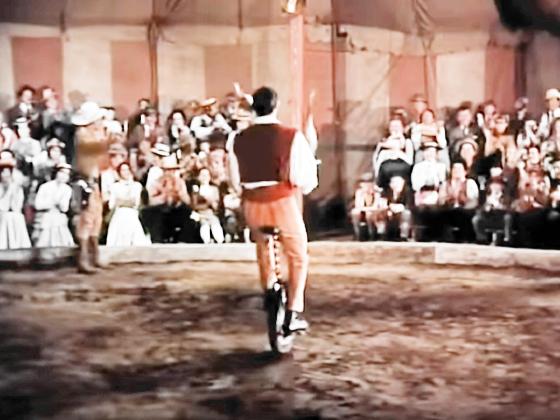 juggles 3 clubs while riding a unicycle,