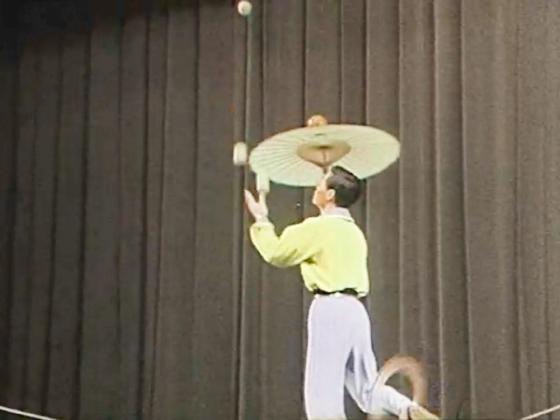 spinning a ring on his free leg, rolling a ball on top of a parasol held