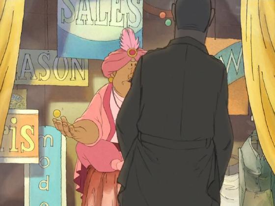 At 1:06:44, a magician sitting in a window briefly