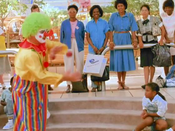 At 15:18, a mall clown juggles 3 balls with some simple tricks for