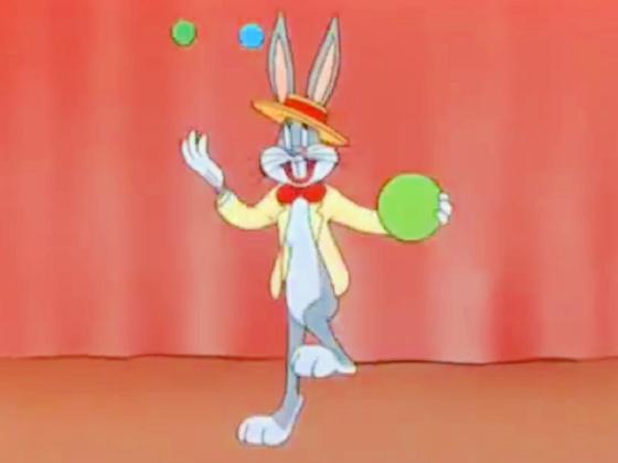 At 03:00, Bugs Bunny enters a stage and starts to juggle 4 balls in