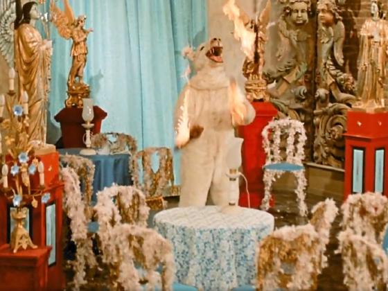 a polar bear costume juggling 3 torches, ending when he is bumped by